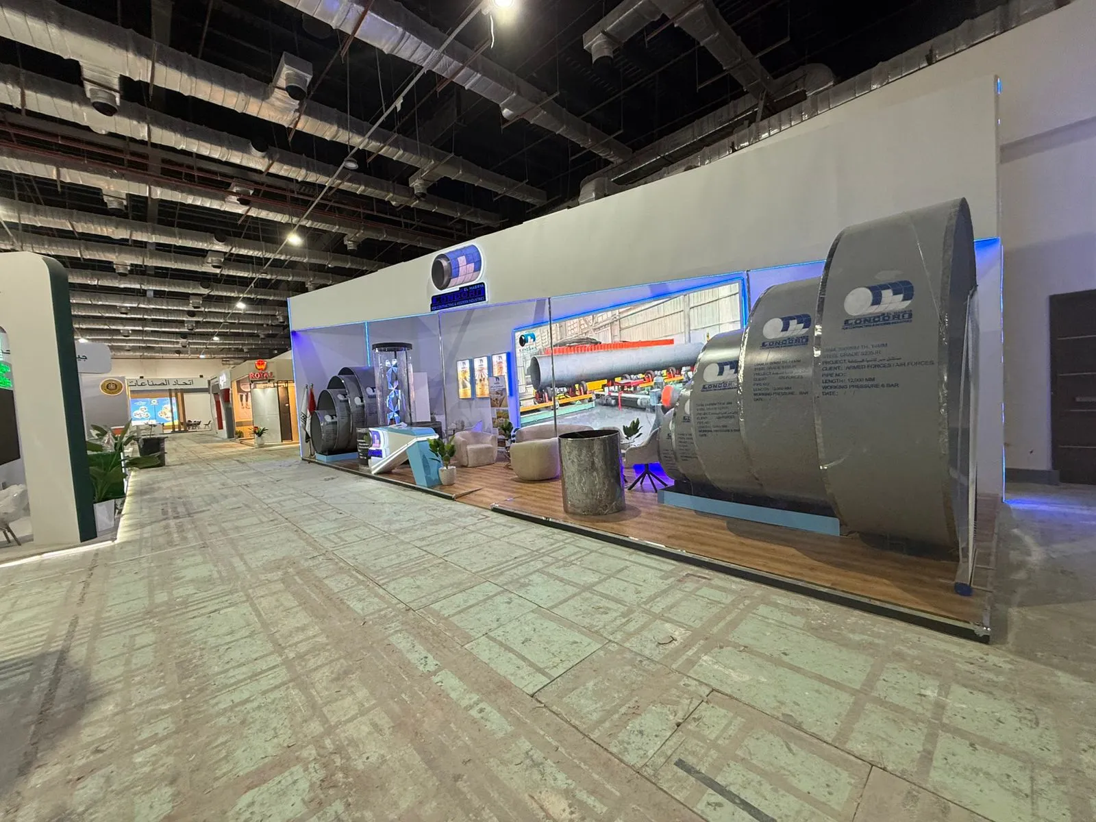 Concord Booth - Transmea 2025 | Client: Concord | Event: TransMEA 2025 | Executed by Apache X, this heavy-duty exhibition booth was engineered to support 34 tons of steel pipes, delivering a strong industrial presence with full safety compliance and precise on-site execution.